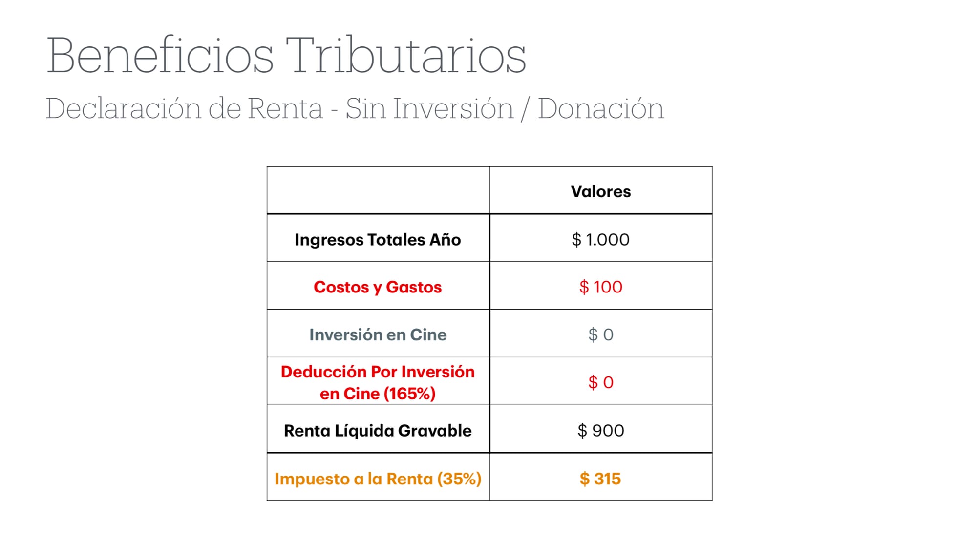 En este primer ejemplo, vamos a ver una declaración de renta sin inversión o donación en nuestro proyecto. Vemos unos ingresos totales de $1.000 pesos y unos costos y gastos por $100 pesos. Tenemos $0 pesos en inversión en cine por lo tanto nuestra deducción es de $0 pesos. Por lo tanto nuestra utilidad antes de impuestos es de $900 pesos. Ya que Mr. Taxes nos cobra el 35%, eso significa que tendríamos que pagarle al gobierno colombiano $315 pesos.