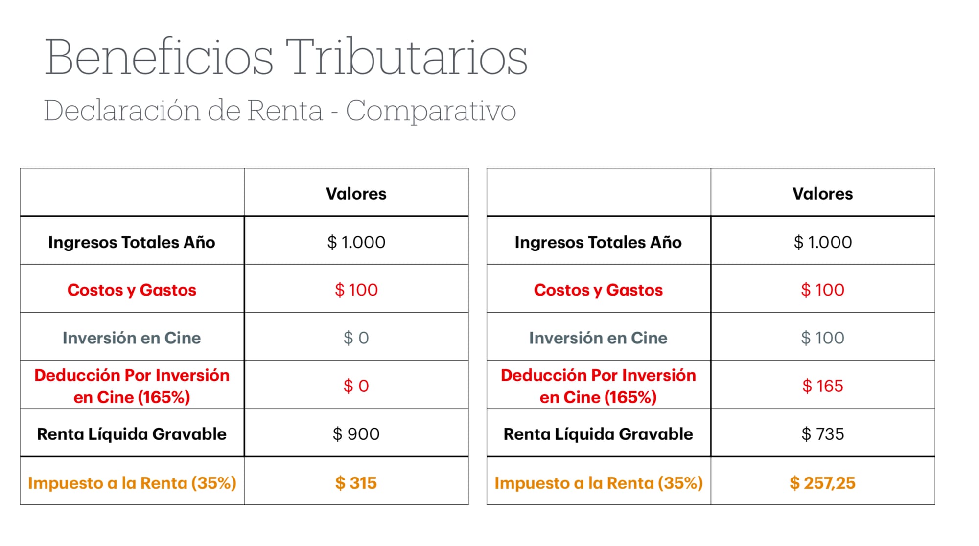 Los beneficios tributarios que se otorgan para las empresas o personas que invierten o donen en una película colombiana es del 165% del valor invertido o donado. ¿Eso qué significa? Que si invierten o donan $100 pesos colombianos a tu proyecto, se van a poder descontar $165 pesos colombianos de su declaración de renta.